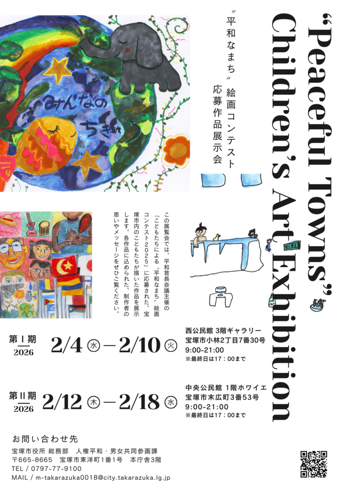 この展覧会では、平和首長会議主催の「こどもたちによる“平和なまち”絵画コンテスト2025」に応募された、宝塚市内のこどもたちが描いた作品を展示します。