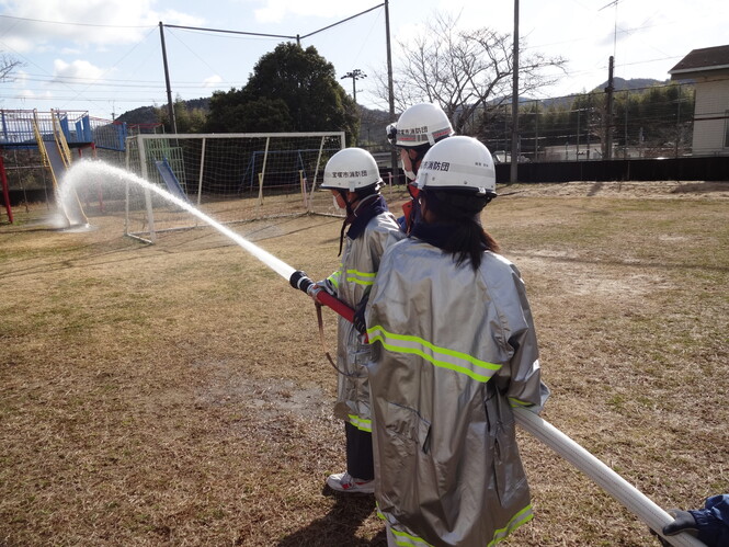 訓練に参加した生徒は、消防団員の機敏な動きと放水の迫力に驚き、消防団員の活動について理解を深めてくれました。