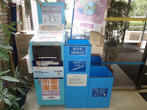 販売店などの回収BOXを利用してください。※クリーンセンター管理棟1F窓口でも引き取ります。