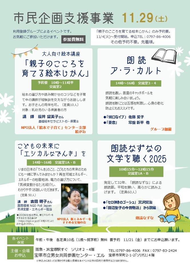 市民企画支援事業(大人向け絵本講座、朗読、再生可能エネルギーの講演会)
