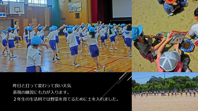 運動場では、1年生がダンスの練習をしていました。先生の動きを見ながら一生懸命練習しています。
