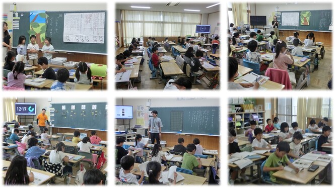 この日に、1年生の子どもたちも元気いっぱいに学習に取り組んでいました。国語の時間には、カタカナの学習を進め、新しい文字を覚えることに挑戦しました。また、物語文「やくそく」の音読では、3匹のアオムシの気持ちになり切り、声の強弱や間の取り方を工夫しながら読むことができました。登場人物の思いを想像して表現する姿は、とても生き生きとしていました。