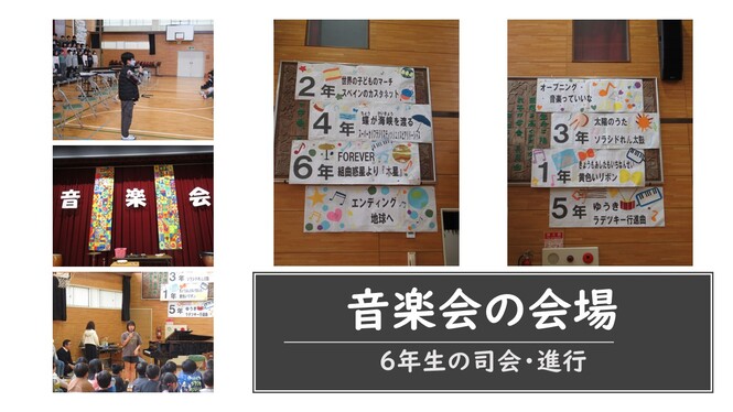 子ども音楽会 ID 6011851 更新日 2024年11月16日 印刷大きな文字で印刷 今日は「子ども音楽会」がありました。明日は「オープンスクール 音楽会」です。今日は,子どもたちがそれぞれの学年の演奏を聴き合う日です。 初めて聞いた学年の演奏に驚いたり,歓声をあげたり,子どもたちなりに演奏会を楽しんでいました。子どもたちはいつもよりフロアの観客(児童)の数に驚き,緊張した様子で演奏をしていました。 1年生から6年生まで学年に応じた楽曲を合奏したり合唱したりします。楽曲に合わせた「呼びかけ(セリフ)」も演奏にちなんだ言葉や動作でとても楽しめました。それぞれの学年の工夫を凝らしたパフォーマンスをぜひ楽しみにお越しください。 司会進行や曲紹介,楽器の移動もすべて6年生の児童が担当です。それぞれの役割をしっかりと果たしていました。 5・6年生の児童は音楽会のすべての準備もしてくれました。楽器を運んだり,椅子を並べたり,掃除をしたり,とにかく一生懸命一人一人が自分の役割をしっかりとはたしていました。とても立派な高学年姿を,見せてくれました。明日の音楽会をどうぞ楽しみにお越しください。
