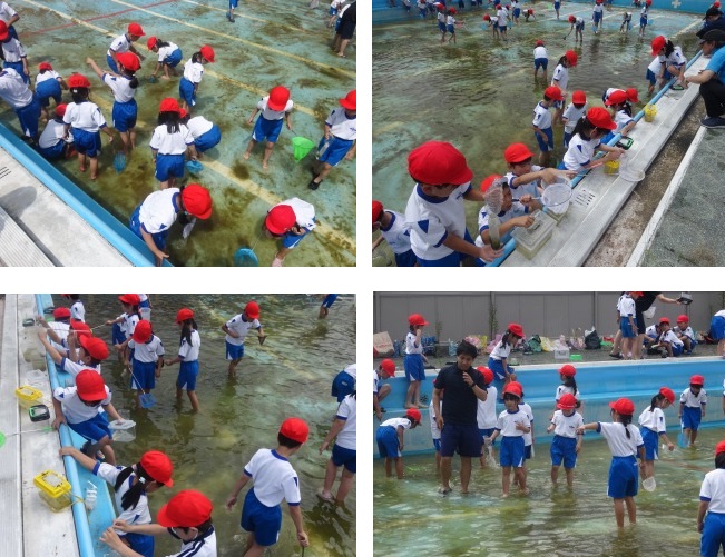 低学年のプールがありました。低学年は水に慣れることが目標です。楽しそうな声が響いていました。