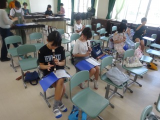 雨の日の休み時間。トランプ、読書、お絵かきなどをする姿が見られました。3年生では消しゴムを指ではじいて落とし合う「消しゴム落とし」が流行っているようです。
