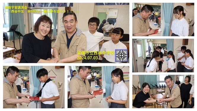 ★暑い中、西谷中学校までお越しいただき有難うございます。生徒たちも音楽の世界で大活躍されているBOROさんのお話と演奏を生で感じることができ、大変貴重な経験になったと思います。私自身、BOROさんが活躍されていた当時はお見掛けしていないのですが、AYAKA基金を立ち上げられ、音楽で得た収益を難病の子どもたちのために寄付されている話を聞いて、そういった形で支援されているBOROさんの人柄に惹かれました。近くで支える人、身体を支える人、金銭的に支える人…、人を救う形はそれぞれで、どれも欠けてはならないものだと感じました。この度は、西谷中で講演いただき誠に有難うございました。吹奏楽部の生徒たちは特に喜んでいました。(教職員)
