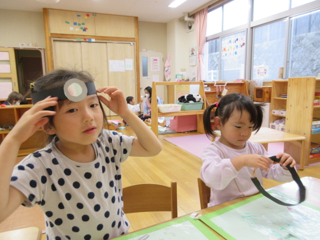 絵本を見て「あ!これ耳鼻科に行ったとき見たことある!」と、頭につけるライトを作ったり、赤ちゃん人形や友達、保育者の患者さんを診察したり、手当てをしたり、往診に出掛ける子どももいます!患者さんが元気になるようやさしく診察をしてくれています♪ 気分はすっかりお医者さん!なりきることを楽しむ子どもたちです😊